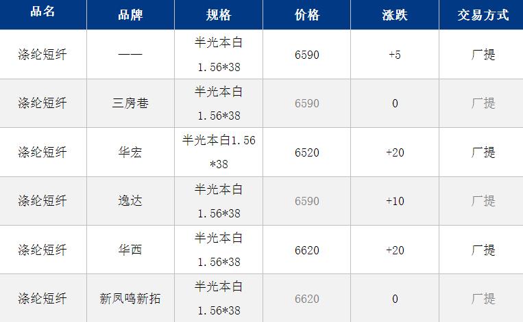 江苏涤纶短纤现货价格上涨5元在6590元/吨;早间江苏主流商谈6580-6640元/吨自提,偏低货源6520元/吨附近。