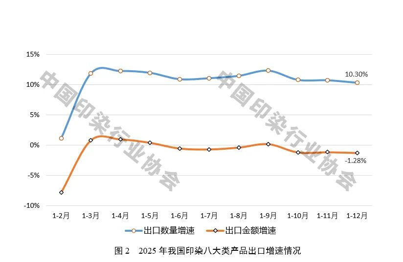 2025年,全球经济增长放缓,国内外市场需求不足,美国关税政策对我国纺织品服装出口造成冲击,我国印染行业出口明显承压。但当前我国印染行业仍具有明显的国际竞争优势,为全球纺织服装生产流通提供了坚实支撑,2025年我国印染八大类产品出口数量再创历史新高,“十四五”期间出口数量累计涨幅达到59.97%,行业出口保持韧性。值得注意的是,全年出口金额增速明显低于出口数量增速,主要印染产品出口平均单价呈下降态势,目前已降至2007年以来最低水平,关税政策扰动叠加市场需求不足,导致出口竞争进一步加剧。