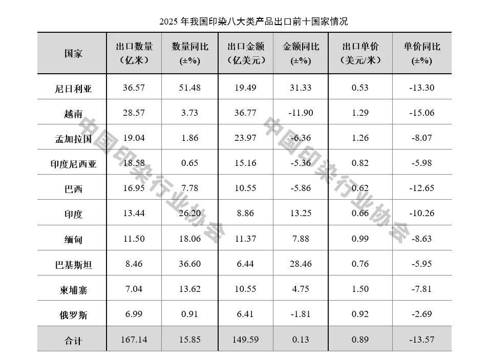 2025年我国印染行业对出口数量排名前十的国家出口规模达到167.14亿米,同比大幅增长15.85%,占出口总量的45.19%,占比较2024年提高2.03个百分点,出口集中度进一步提高。尼日利亚对出口数量增长的贡献率达到54.34%,全年对尼日利亚出口数量36.57亿米,同比大幅增长51.48%。此外对巴基斯坦、印度、缅甸、柬埔寨等国家出口数量增速也明显高于整体出口水平,对越南、孟加拉国等传统市场出口增速显著低于整体水平,反映出在美国关税政策影响下,我国印染行业积极调整市场结构,加快拓展新兴市场发展空间,以产业韧性有效应对外部冲击。对前十国家出口平均单价均呈下降态势,其中对越南下降15.06%,降幅居前十国家首位。