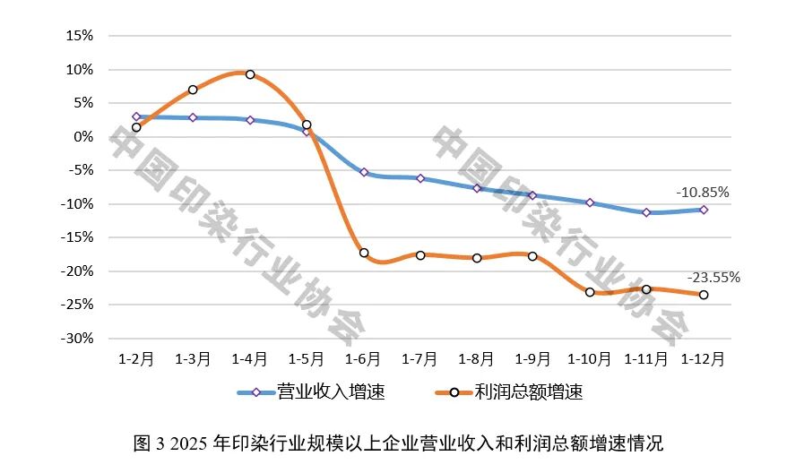 2025年受终端需求偏弱、出口竞争加剧等因素影响,印染企业生产经营压力明显上升,运行质效持续下滑。据国家统计局数据,2025年1-12月规模以上印染企业营业收入同比下降10.85%,降幅较前3季度加深2.14个百分点;利润总额同比下降23.55%,降幅较前3季度加深5.79个百分点;成本费用利润率5.03%,同比降低0.84个百分点;营业收入利润率4.64%,同比降低0.77个百分点。行业亏损情况进一步加深,1869家规模以上企业亏损户数为616户,亏损面32.96%,同比扩大3.03个百分点;亏损企业亏损总额36.47亿元,同比增长19.96%。2025年以来纺织产业链各环节经济运行均有所承压,与纺织全行业相比,印染行业主要经济效益指标降幅更为明显,全年印染行业营业收入、利润总额降幅分别高于纺织全行业2.62和7.43个百分点,亏损面高于纺织全行业10.32个百分点。