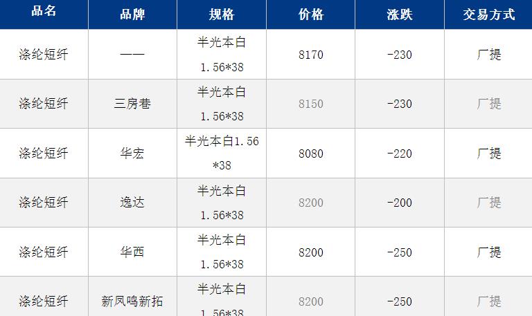 1.4D半光直纺涤纶短纤江浙商谈重心8000-8500元/吨出厂或短送,福建主流商谈8200-8700元/吨现款短送,山东、河北主流8150-8600元/吨送到。