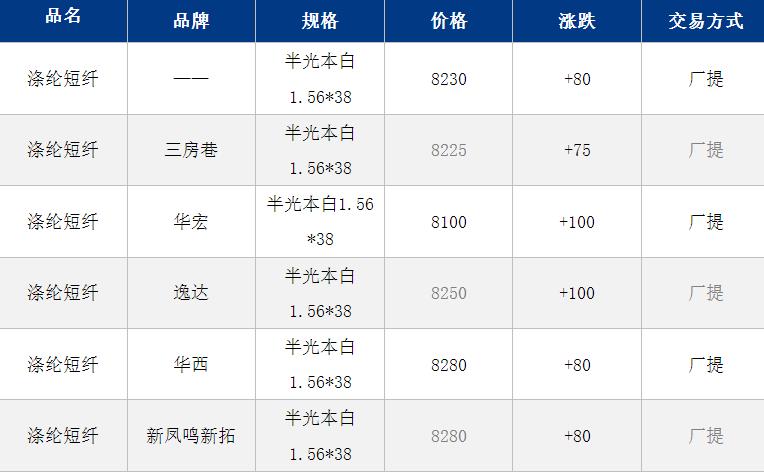 1.4D半光直纺涤纶短纤江浙商谈重心8150-8450元/吨出厂或短送,福建主流商谈8500-8600元/吨现款短送,山东、河北主流8250-8550元/吨送到。