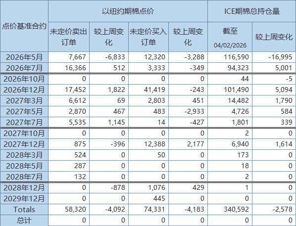 4月9日(周四),美国商品期货交易委员会(CFTC)周四公布,截至4月2日,以ICE期棉2026年5月合约点价未定价卖出订单(UnfixedCallSales)较前周减少6833手至7677手。