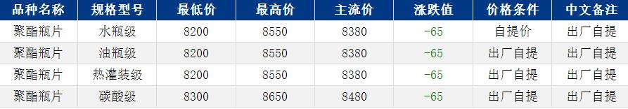 华东聚酯瓶片收于8380元/吨,涨跌值-65元/吨,商品情绪拖累,化工品普遍偏弱,聚酯瓶片价格下滑。4月主流货源报盘8200-8550元/吨,递盘8300-8200元/吨;或期货合约2605升水380-400;部分略低7950-8200元/吨。