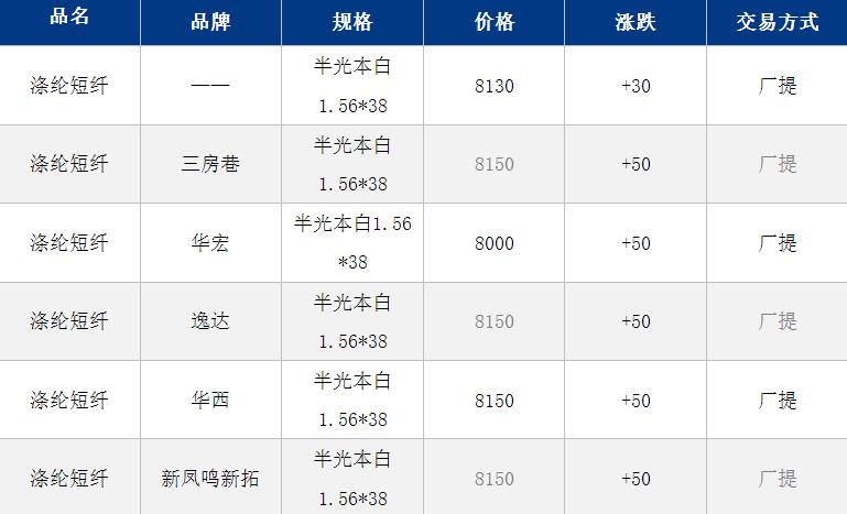 江苏涤纶短纤现货估价上涨30元至8130元/吨;早间短纤现货商谈参考8100-8200元/吨,偏低8000元/吨附近。