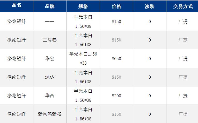 1.4D半光直纺涤纶短纤江浙商谈重心8150-8400元/吨出厂或短送,福建主流商谈8150-8350元/吨现款短送,山东、河北主流8200-8550元/吨送到。