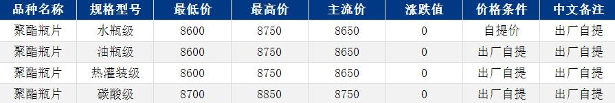 华东聚酯瓶片收于8650元/吨,涨跌值0元/吨,原油上涨,然而原料拖累,聚酯瓶片高位震荡,4月货源报盘8600-8750元/吨,部分略低8450-8500元/吨,零星递盘8600元/吨附近,暂无实单商谈。美伊关系反复化,业内观望情绪浓厚。