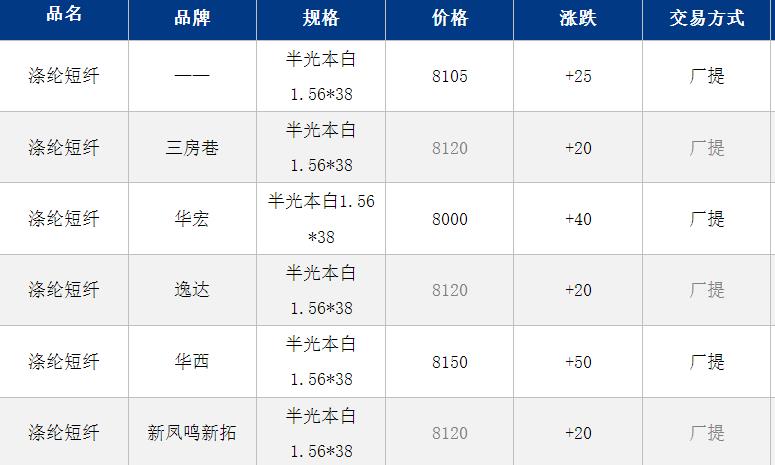 1.4D半光直纺涤纶短纤江浙商谈重心8050-8350元/吨出厂或短送,福建主流商谈8050-8300元/吨现款短送,山东、河北主流8150-8450元/吨送到。