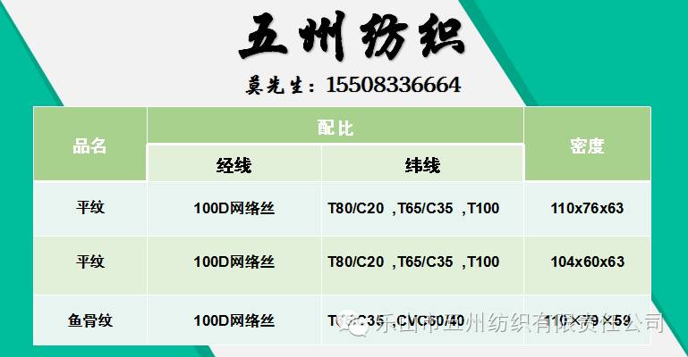 五州董事长丁洪埝:一个企业的成功离不开成功的品牌,而一个品牌的成功则需要多种因素的相互作用。先进的生产设备,是品牌成功的技术保障;严谨的工作作风,则是促使品牌成功的重要因素。五州纺织正是凭借先进的生产设备和严谨的工作作风,切实保证产品质量和供货周期,一步一个脚印,加强自我研发能力,努力实行新工艺,开发新产品,*终让五州信誉享誉全国。另外,良好的服务,也是五州公司成功占据市场份额的一*宝。