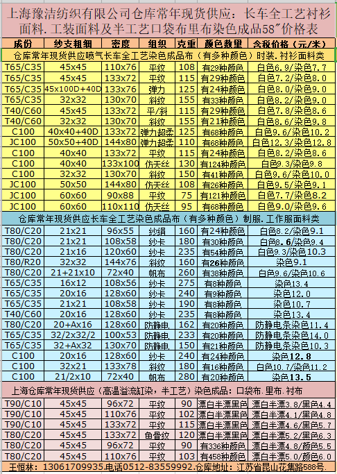 公司技术力量雄厚,产品质量稳定。积极致力于产业升级。产品方向立足于工装面料的研发和生产,坯布品种包括:涤棉平布、涤棉纱卡、涤棉线卡、涤棉府绸;全棉府绸、全棉纱卡、全棉线卡、全棉帆布、全棉弹力主要销往山东、江苏、浙江、四川、湖南等地。特别是本公司在上海设有大型仓库,现货供应品种有四大系列:(1)工装面料系列。(2)衬衫面料系列(3)各种规格全工艺漂白.半漂布成品布系列。(4)涤棉口袋布系列:58"T80/C20 45X45/110X76、 96X72漂白.半漂.黑色(有300多种颜色)口袋布。为国内各大知名品牌的工装企业和服装出口企业长期提供面料。