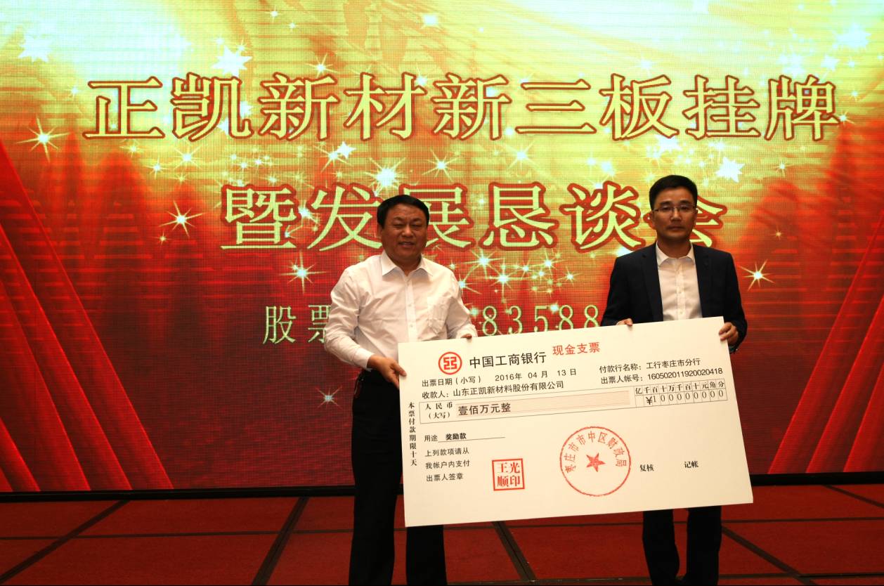 会议进行了颁奖仪式,由枣庄市市中区区委书记宋淑启代表区政府向正凯新材颁发挂牌新三板区级奖励资金100万元,市金融办主任刘中波代表市政府向正凯新材颁发挂牌新三板市级奖励资金100万元,颁奖仪式将会议推向了高潮,进一步增强了参会企业负责人坚定走资本市场发展道路的决心。