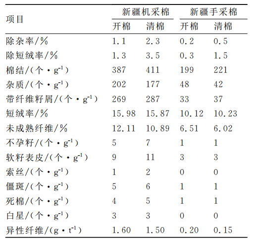 表1数据说明,从开棉到清棉,新疆机采棉和手采棉除杂率、除短绒率都在增加,前者比后者高4~5倍。这是因为新疆机采棉本身杂质、短绒率的含量比新疆手采棉高2~6倍。棉层棉絮危害性疵点、危害性纤维在开棉、清棉的测试统计,说明新疆机采棉含有的危害性纤维组成复杂,危害性疵点数量很大且细小,很难使其成倍减少。为防止新疆机采棉在轧花过程中粉碎性打击形成更多的危害性疵点、危害性纤维,需要采用合理的抓取工艺,而其棉层棉絮更多的异性纤维则需要在收割、轧花时解决,减轻清梳联的预梳理负担。