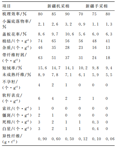 清梳联、梳棉、精梳工序的开松、除杂、除短绒、预梳理、梳理对棉花中的危害性疵点、危害性纤维的清除都具有一定的局限性,所以新疆机采棉、手采棉的质量在一定程度上决定了清梳联、梳棉、精梳工序的梳理效率和梳理效果。梳理工艺和梳理器材专件的发展,一定程度控制了新疆机采棉具有的高危害性纤维、危害性疵点,但是其生产成本较高,最终棉纱质量、面料质量也并不理想。所以提高新疆机采棉质量,从源头减少机采棉中的危害性疵点、危害性纤维仍是发展重点。