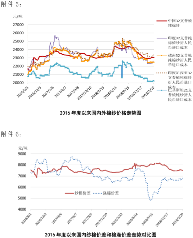 本周,美联储宣布维持利率不变,暗示今年不会再加息,引发美元指数一度回落,促使国际棉花价格整体上涨。2019年3月18-22日,纽约棉花期货主力合约结算价84.42美分/磅,较上周上涨1.27美分/磅,涨幅1.53%,代表进口棉中国主港到岸均价的国际棉花指数(M)84.42美分/磅,较上周上涨1.27美分/磅,涨幅1.53%,折人民币进口成本14369元/吨,较上周上涨210元/吨,涨幅1.49%;内外棉价差1183元/吨,较上周缩小179元/吨。(详见附件1)