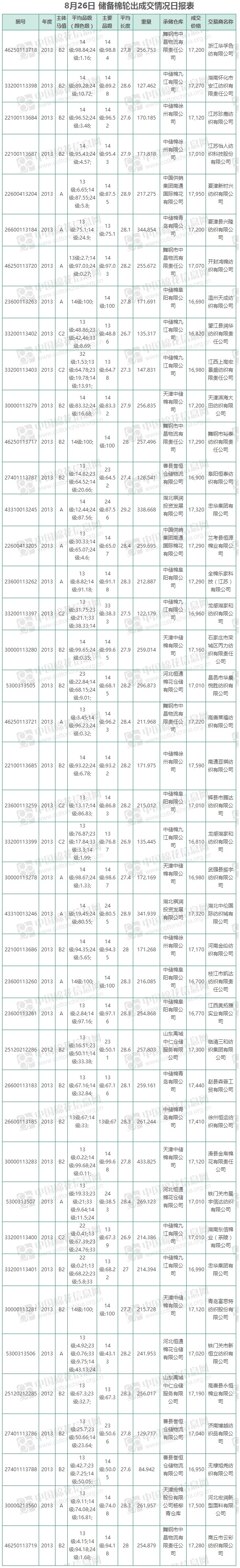 8月26日储备棉轮出销售资源9376.90吨,实际成交9376.90吨,成交率100%,成交均价17159元/吨,较25日下跌166元/吨,折3128价格18601元/吨,较25日下跌141元/吨。