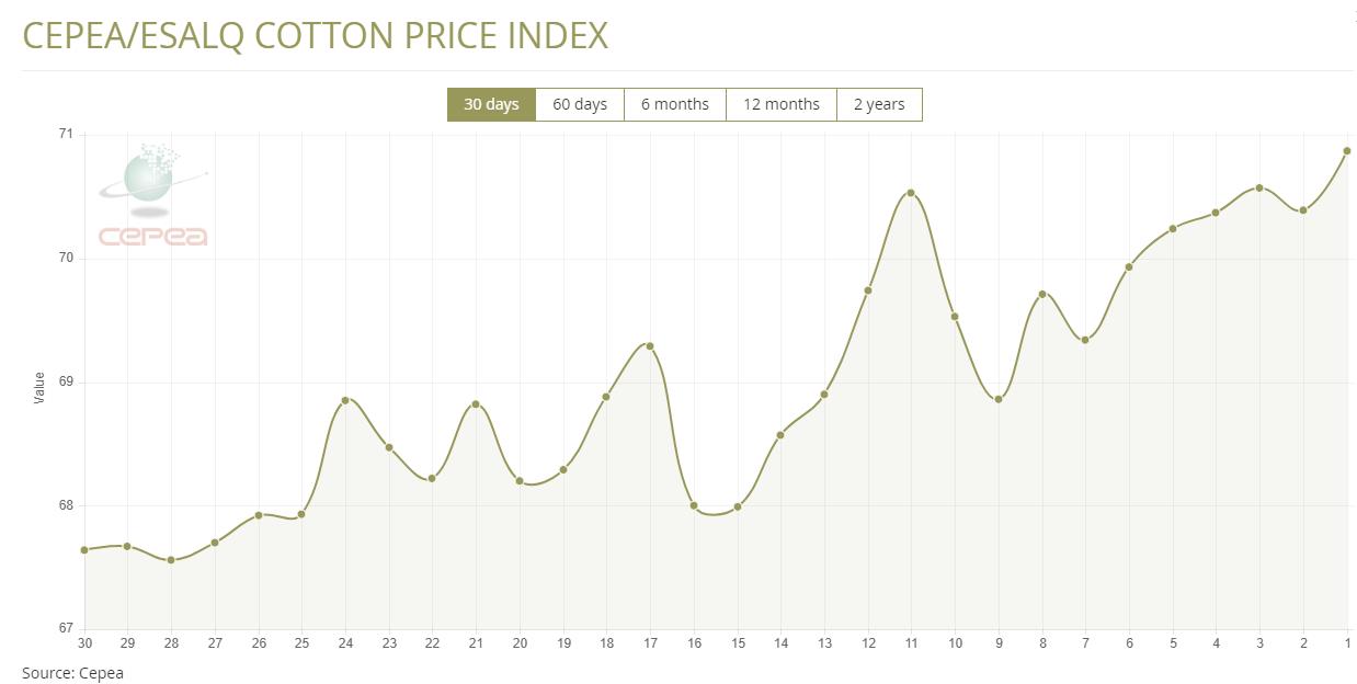 据外电2月6日消息,2月6日巴西CEPEA/ESALQ棉花价格指数报70.87美分/磅,较前一交易日上涨0.68%。