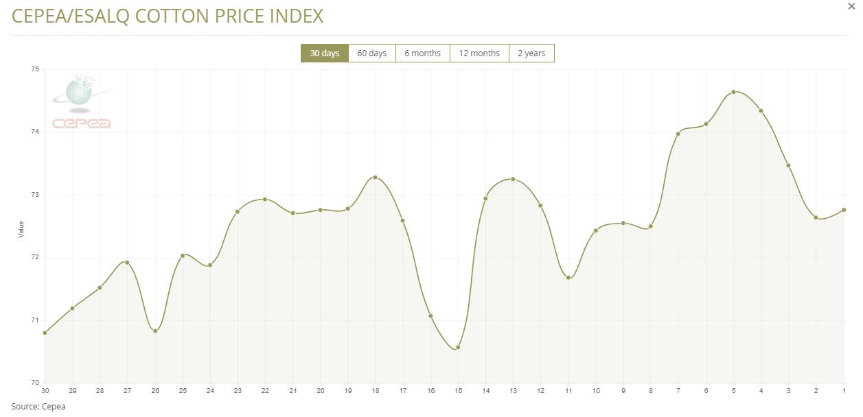 2025年3月24日,巴西CEPEA/ESALQ棉花价格指数报72.76美分/磅,较前一交易日上涨0.17%,该指数较前月同期增长3.1%。