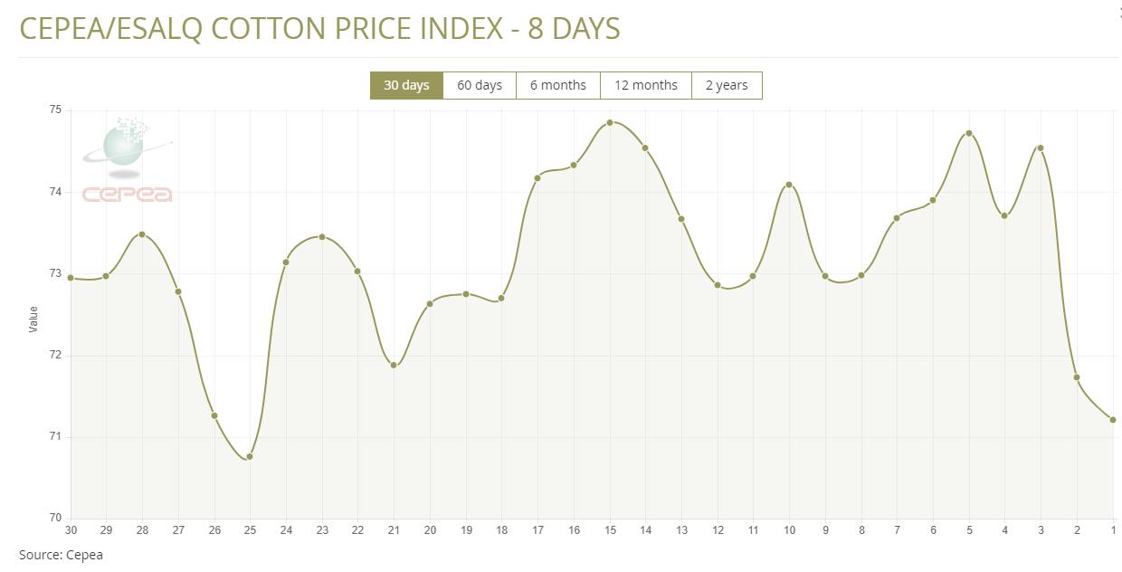 4月7日(周一),巴西CEPEA/ESALQ棉花价格指数报71.21美分/磅,较前一交易日下跌0.72%,该指数较前月同期下跌3.64%。