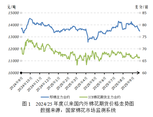 9月,国内新棉逐步成熟,丰产态势基本明确,市场供应压力显著攀升,国内棉价一路下行。美联储降息预期兑现后,国际市场重新聚焦于棉市供应压力,国际棉价先涨后跌,总体跌幅有限。棉价走势扭转此前的“内强外弱”特征,内外棉价差从本年度最高水平回落。