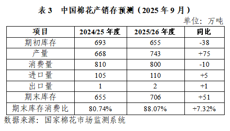 据国际棉花咨询委员会(以下简称ICAC)9月发布的2025/26年度全球棉花产销存预测数据,产量为2555万吨,同比增加16万吨,环比减少36万吨;消费量为2552万吨,同比增加3万吨,环比减少4万吨。总体上看,2025/26年度全球棉花产需基本平衡。