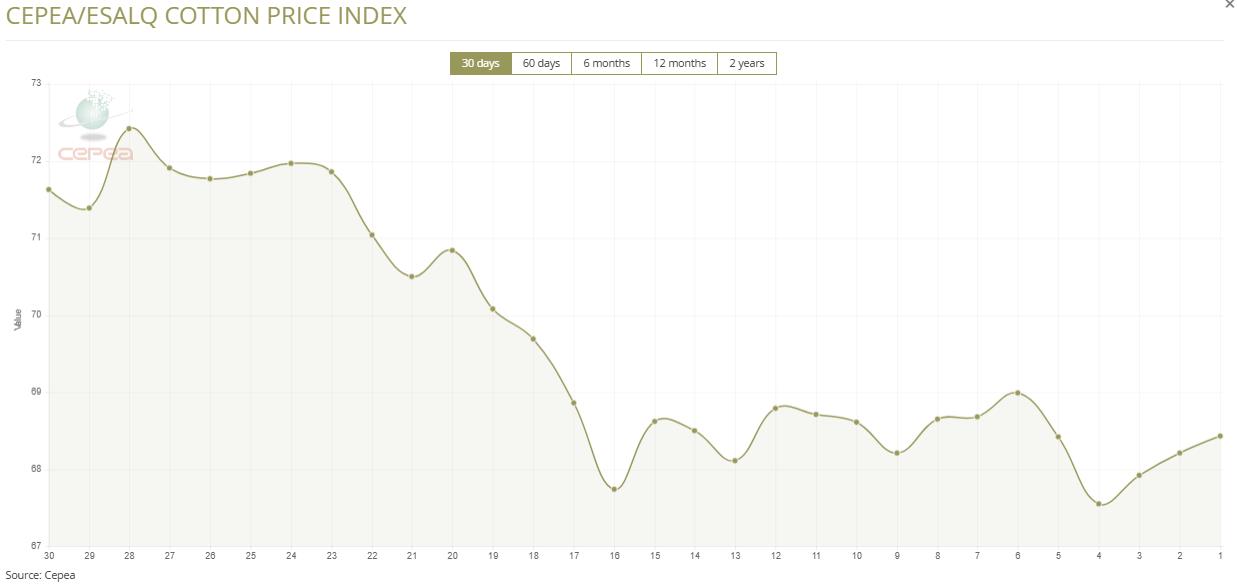 9月30日(周二),巴西CEPEA/ESALQ棉花价格指数报68.43美分/磅,较前一交易日上涨0.32%,较上月同期下跌4.77%。