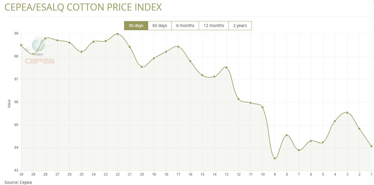 10月22日(周三),巴西CEPEA/ESALQ棉花价格指数报64.07美分/磅,较前一交易日下跌1.19%,较上月同期下跌6.37%。