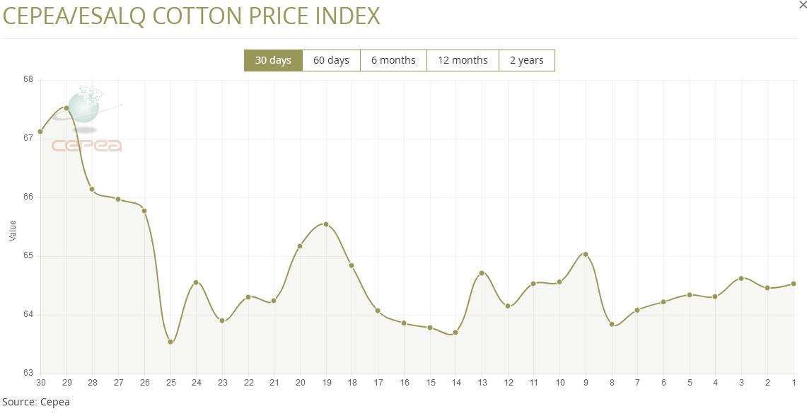 11月13日(周四),巴西CEPEA/ESALQ棉花价格指数报64.53美分/磅,较前一交易日上涨0.11%,较上月同期下跌0.05%。
