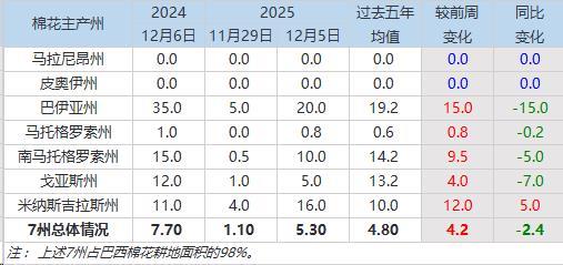 12月8日(周一),巴西国家商品供应公司(Conab)公布的数据显示,截至2025年12月5日当周,2025/26年度巴西棉花种植率为5.3%,前周为1.1%,上年同期为7.7%,五年均值为4.8%。