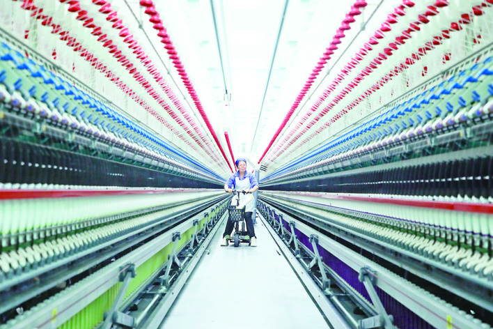 1月5日,位于库车经济技术开发区的一纺织厂生产车间,员工在数字化多功能混纺纱生产线上巡查生产情况。