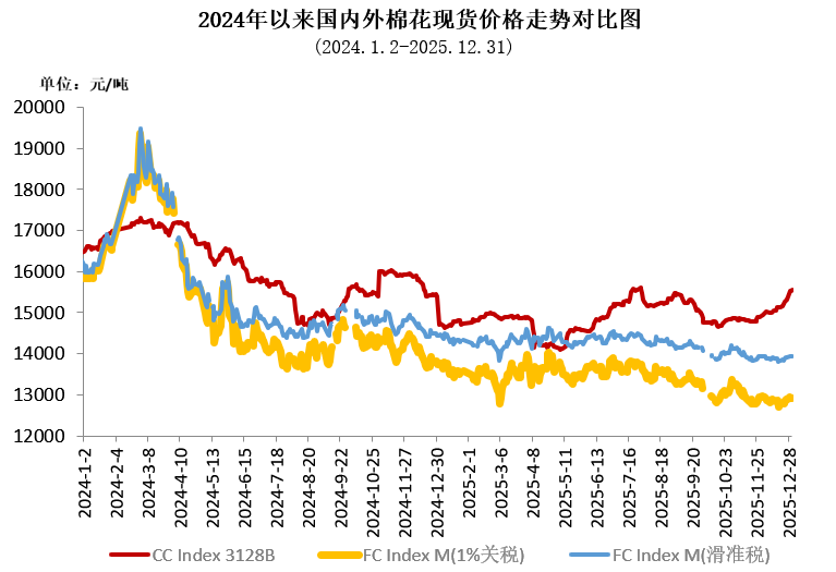2025年国内棉价震荡运行,总体呈现“先稳后跌、再涨回升”的波动走势。受美国加征关税政策冲击,中国棉花价格指数年内最低跌至14100元/吨,但在国内促消费政策、中美经贸磋商进展等因素影响下年中最高涨至15609元/吨,下半年新疆棉花产量再创新高,对棉价上涨有所抑制,但在宏观环境改善的推动下年底仍回升至15500元/吨以上的年度相对高位。中国棉花价格指数全年均价14903元/吨,同比下跌6.7%。