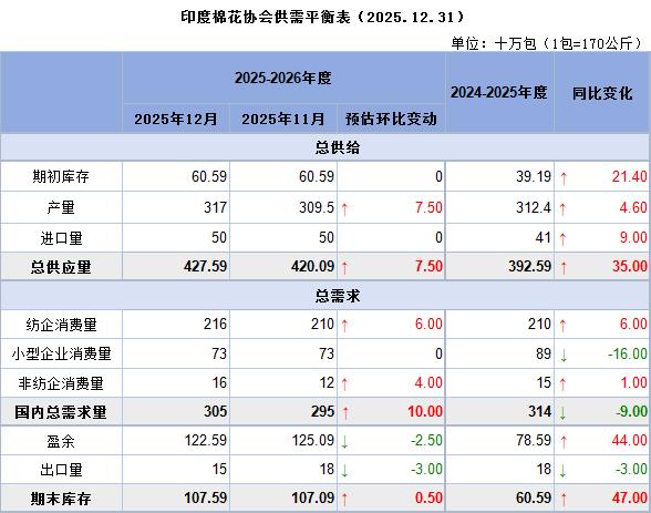 CAI主席VinayKotak在一份声明中表示,预计截至9月的当前2025/26年度棉花消费量为3050万包,略低于上一年度的3140万包。截至12月底,消费量估计为762.5万包。政府提供的截至去年12月31日的免税进口窗口促使贸易商和工厂进口310万包。