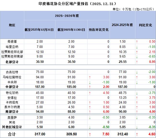 CAI将2025/26年度棉花出口预测下调30万包,从上一年度的180万包降至150万包。截至12月底,已出口约45万包。