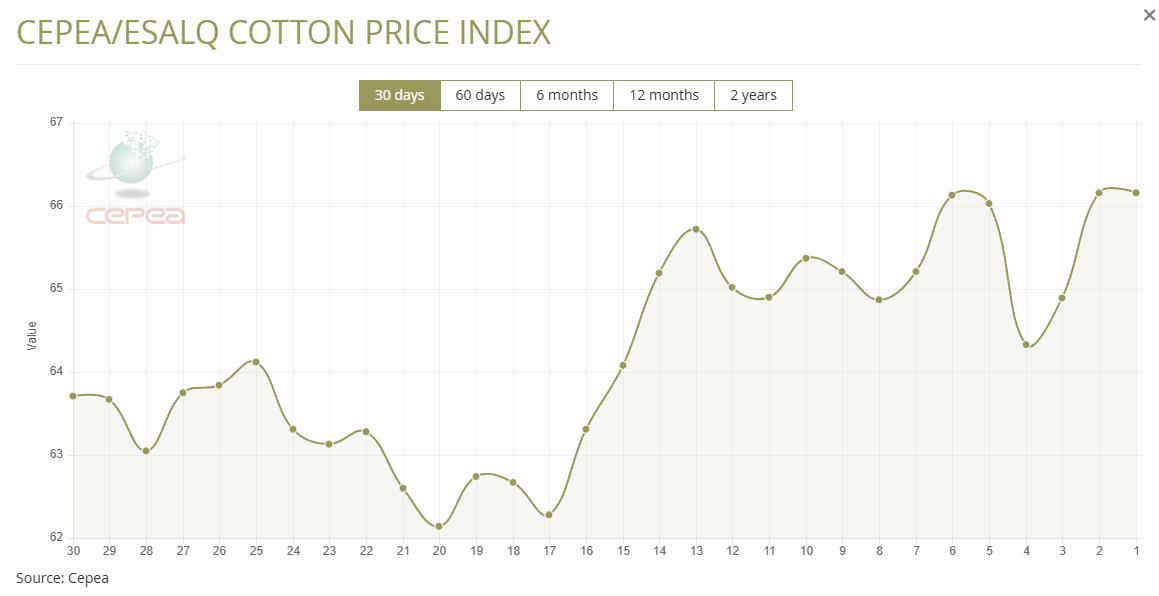 1月22日(周四),巴西CEPEA/ESALQ棉花价格指数报66.16美分/磅,较前一交易日持平,较上月同期上涨4.50%。