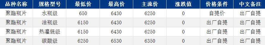 华东聚酯瓶片收于6250元/吨,涨跌值0元/吨,原油震荡偏弱,支撑乏力。现货流通紧张,逸盛工厂基差上调10元/吨,重心僵持整理。2月货源报盘6150-6430元/吨,递盘6130-6300元/吨;3月货源报盘6180-6400元/吨,递盘6130-6160元/吨。
