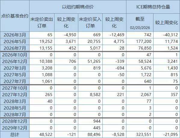 2月26日(周四),美国商品期货交易委员会(CFTC)公布,截至2月20日,以ICE期棉2026年5月合约点价未定价卖出订单(UnfixedCallSales)较前周增加3671手至19252手。