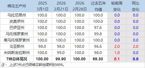 3月2日(周一),巴西国家商品供应公司(Conab)公布的数据显示,截至2月28日当周,2025/26年度巴西棉花种植率已达100%,前周为99.9%,上年同期为100%,五年均值为99.3%。