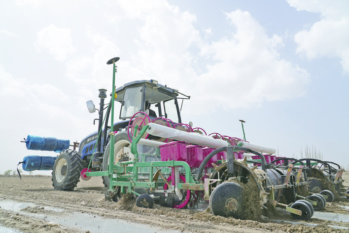 装有北斗卫星导航系统的播种机,可按预先设定的播种线路精量播种,实现滴灌带、地膜铺设全程机械化,直线误差不超过2厘米,相比传统播种模式,可节约棉种50%以上,为后续田间管理、采收提供便利。