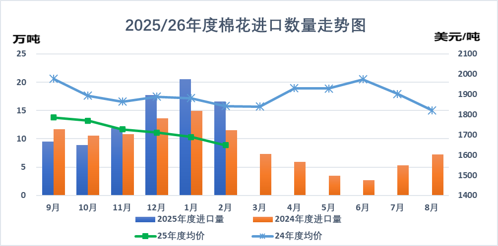 据海关数据,2月我国进口棉花16.6万吨,环比下降18.9%,同比增长44.1%。2026年前2个月进口棉花37.2万吨,同比增长41%。2025/26年度前6个月进口85.1万吨,同比增长16.5%。本月进口量环比回落,主要是春节假期港口通关效率受到影响,企业采购节奏有所放缓;同比大幅增长,主要由于外棉价格优势突出,下游纺织厂补库需求旺盛,前期预购订单集中到港。