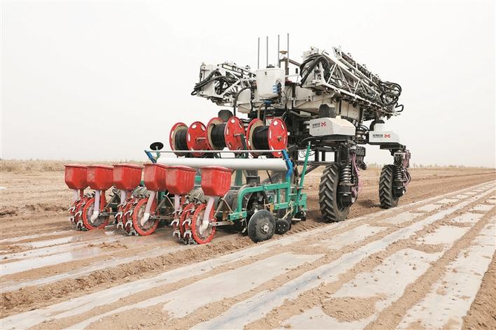 4月10日,一师二团二十六连农田里,一台由觉物科技(深圳)有限公司研发的FR鹤出T3000播种机器人在播种棉花。该播种机器人适用多种地形,能高效完成铺膜、铺滴灌带、播种、覆土等工序。近年来,一师阿拉尔市积极推广应用智能化、便捷化、国产化农业科技装备,以科技赋能农业生产,助力丰产丰收。
