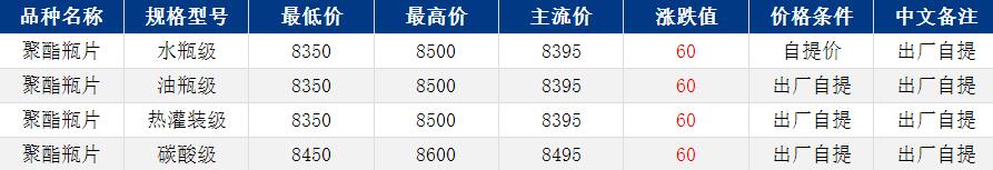 华东聚酯瓶片收于8395元/吨,涨跌值60元/吨,美伊谈判无实质性进展,原油上涨,带动聚酯瓶片重心上扬。4月货源报盘8350-8500元/吨,部分略低7990-8300元/吨,或期货合约2605升水550-700,递盘8350-8400元/吨;由于缺少方向性指引,下游买气偏弱。