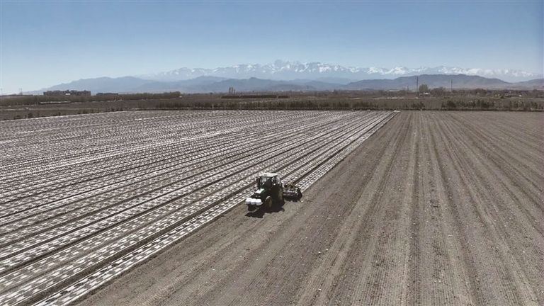 4月16日,城关镇良繁中心村,搭载北斗导航系统的精量播种机正在田间来回穿梭,铺膜、播种、覆土、铺设滴灌带等工序一气呵成。