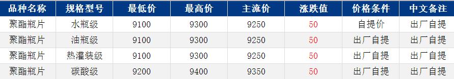 华东聚酯瓶片收于9250元/吨,涨跌值50元/吨,化工品表现偏弱,然而原油仍偏强,聚酯瓶片重心窄幅上扬。5月货源报盘9100-9300元/吨或期货合约2606升水450-550,部分略低9000-9100元/吨或期货合约2606升水200-280;零星递盘9150元/吨。