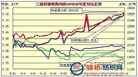 由于新棉收购价格连上扬,为规避风险,收购量减少,市场资源有价无市,国储棉更受青睐,但投放量大幅减少,竞价十分激烈,价格持续上扬。10月14日计划抛售2008年度储备棉17796吨,全部成交;平均等级3,较昨日提高0.09,平均长度28.31,较上一日提高0.03;加权成交价14016元/吨,较昨日上涨167元,折328级成交价为13971元/吨,较昨日涨121元。其中328级均价13949元/吨,涨71元,最高14200元/吨,最低13520元/吨;329级均价14069元/吨,涨275元,最高14340元,最低13960元/吨。截止10月14日,累计成功抛售储备棉1926498吨,其中2008年度储备棉1299015吨,2003-2005年度棉花627484吨 ;当日有250家交易商参与竞卖,有55家企业最终成交,当日推出资源总捆数120捆,实际成交120捆。