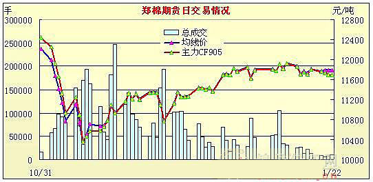 ; 1月22日,郑棉主力合约0905高开35点,但开盘后价格遍一路下跌,随后反弹至开盘价11730点,再无上涨力度,价格又回落大幅下跌至最低点11675,午盘收于11700点,上涨5点,涨幅0.04%。春节前期市场观望气氛浓厚,今日成交量、持仓量继续萎缩减少。盘面上,从日K线图看,期价已经跌破短期均线的支撑,30日均线承受很大的支撑力度,期价重心下移;MACD指标中绿柱继续加长,空头排列趋势增长。节前,很多 纺织企业提前放假,收储也因互联网恶意攻击而暂停,短期内预计没有太大的上涨空间,阻力依旧在12000元一线,支撑为11600元一线,短期内期价仍将会在11500-12000之间震荡盘整。