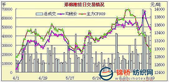 8月19日,郑棉CF1001合约小幅低开,午前反复震荡,午间多头平仓盘打压期价走低,午后重心下移盘整,日线形成中阴线,主要合约成交量放大,持仓量下滑。CF1001合约日成交19076手,日减仓2232手,终盘持仓量32746手;CF1005合约日成交1666手,日减仓610手,终盘持仓量4120手。基本面情况:因新增60万吨抛储棉,市场资源紧张的局面立刻松懈下来,近日现货市场皮棉报价小幅下调,市场成交清淡。一些大的纺织企业前期积极竞价大量拍买储备棉,目前皮棉出现价格小幅度下滑,令一些企业为大量的高价库存原料担心。但与此同时,对国储棉的参与积极性有些打落。另,目前山西、陕西两地的新棉也零星采摘,但收购价格暂不明朗,部分厂家已做好开称收购准备,但多数厂家持谨慎入市的态度。棉农对新棉价格的期望相对较高。