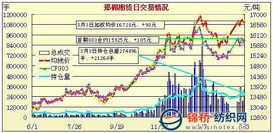 3月3日,郑棉主要合约平开,CF1009合约早盘惯性下探后低位换手,随后多头集中买盘推动期价冲高,此后高位震荡盘升,尾盘在短线平仓的作用下调整,日线形成阳线,日内成交量放大,持仓量大量增加。CF1005合约日成交15264手,日减仓2380手,终盘持仓量60576手;CF1009合约日成交294112手,日减仓20258手,终盘持仓量164776手。基本面情况:现货市场棉商报价继续上调,下游纱线销售有所启动,部分纺企继续上调棉花采购价格,成交略有好转。北部地区河北、山东受大雪影响,购销缓慢。皮棉价格的上涨,带动零星收购的企业上调籽棉收购价格。