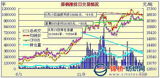 4月19日,郑棉主要合约低开,CF1009合约早盘横向盘整,午前在空头卖盘打压下走低,午后在短线回补的推动下反弹,日线形成低开阴线,日内成交量放大,持仓量继续增加;CF1101合约低开后盘整,午前在近月下跌的带动下出现恐慌性平仓盘,打压期价下落,日线形成小阴线,日内成交量与前一日基本持平,持仓大幅减少。CF1009合约日成交103712手,日增仓8254手,终盘持仓量161270手;CF1101合约日成交54222手,日减仓2760手,终盘持仓量78340手。基本面情况:现货价格整体维持平稳,三级及三级以上棉花价格仍居高,报价继续上扬。据纺企反馈,安徽内地新疆棉二级最高已报到17400元/吨,内地棉三级报价16800元/吨。下游纱线止涨,供应增加,纺厂后期关注广交会接单情况。新棉种植较早的山西、陕西、安徽、甘肃等地遇低温天气,部分已出土的棉苗遭受冻害。大部分未种植棉花的地区,新棉种植推迟。