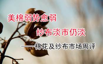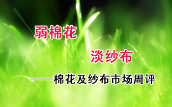 【锦桥纺织网专稿】2013年5月份的第五周,花纱布市场行情呈现美棉弱势愈弱,纱布淡市仍淡的弱势运行的走势。外棉期、现货价格均继续下跌,但降幅比上周大幅收缩;国棉期、现货继续弱势盘整运行,微小幅度下降;涤纶短纤稳中走弱,小幅下调,粘胶短纤价格与上周持平;纱、布淡市弱行,销势疲滞,让利促销,售价下调。(参见:
