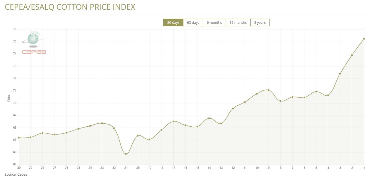 文章原地址:3月31日巴西CEPEA/ESALQ棉花价格指数报75.22美分/磅