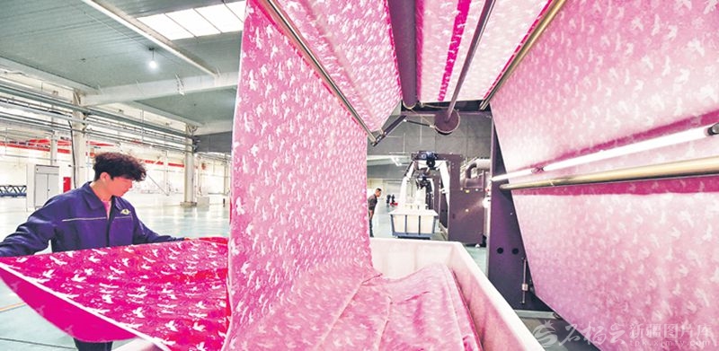 10月9日,工人在位于库尔勒经济技术开发区的新疆德利家纺印染科技有限公司数码印花车间查看产品。当日,该公司日产50万米智能化数码印花项目投产,标志着该开发区纺织服装产业在智能化、绿色化、全产业链发展上迈出关键一步。